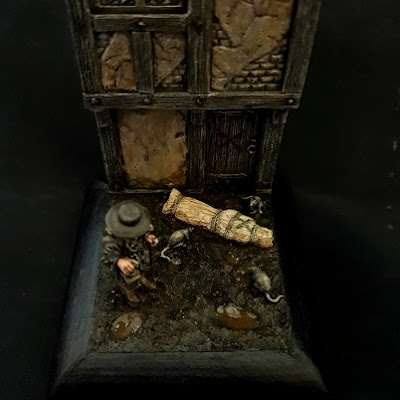 Von Michel habe ich die tolle Pestarzt-Figur bekommen. Da war es naheliegend, dass ich damit eine kleine Vignette machen wollte. In dieser Szene habe ich versucht, die drastischen Verhältnisse der damaligen Zeit einzufangen.